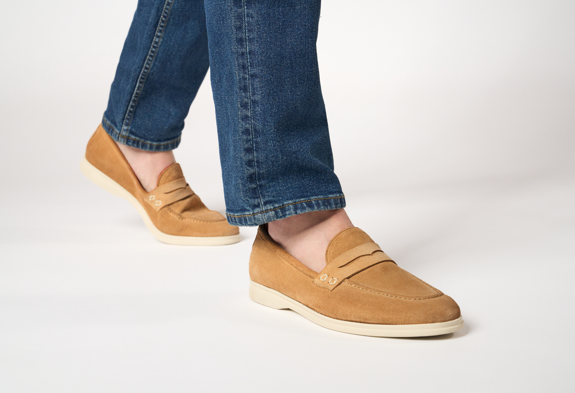 Il design pulito e minimalista è arricchito da dettagli curati, come la classica mascherina con cuciture a vista, che aggiunge un elemento di sobria eleganza. La morbidezza della pelle scamosciata garantisce un comfort superiore fin dal primo indosso, avvolgendo il piede con delicatezza.